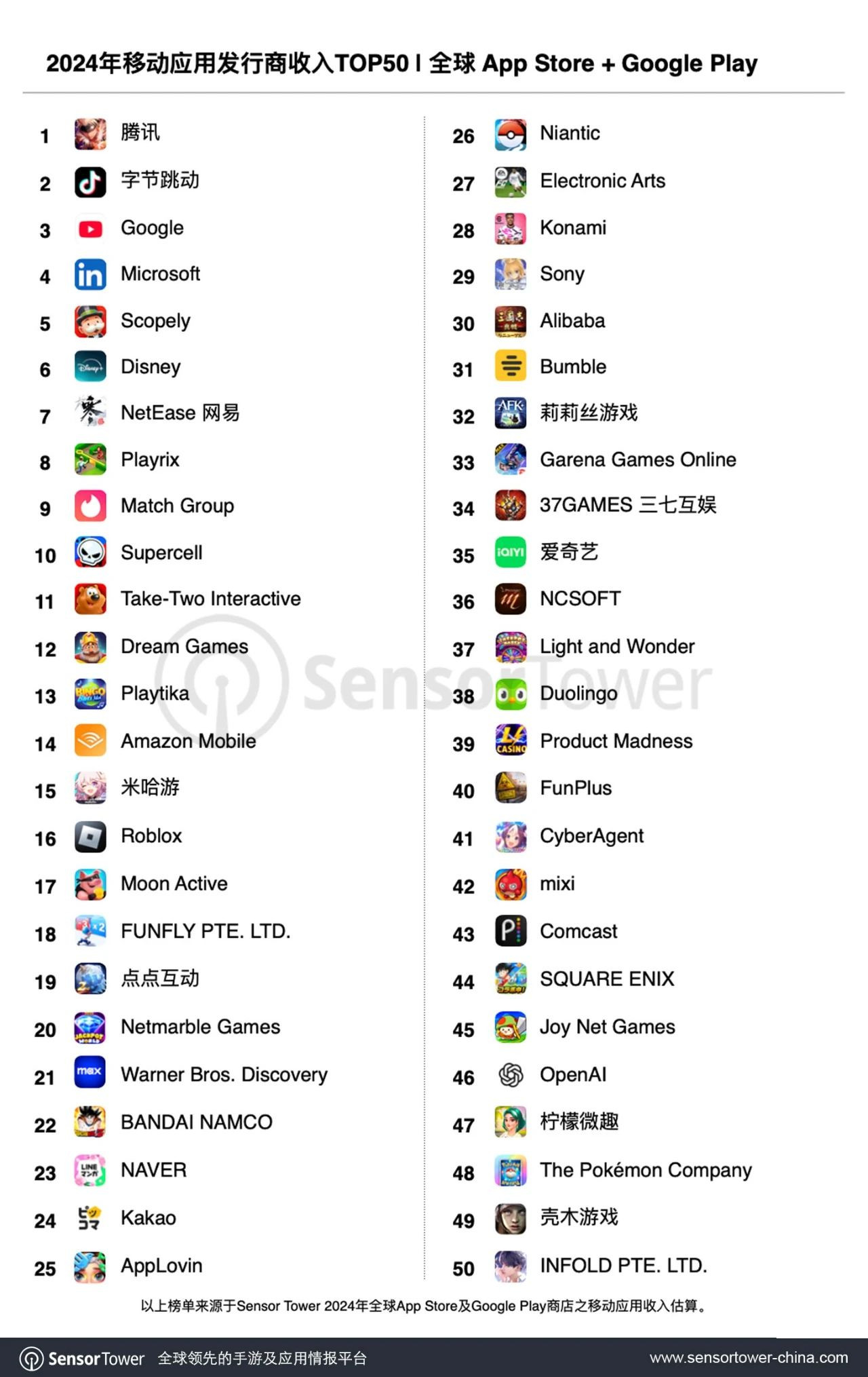 继此前发布转移端游戏阛阓阐发后,Sensor Tower 于最近发布了 2024 年人人转移运用刊行商收入 Top50,果如其言,腾讯不单是在转移游戏阛阓排在人人第一,在鸿沟更大的转移运用阛阓统计当中,依旧是位于第一。