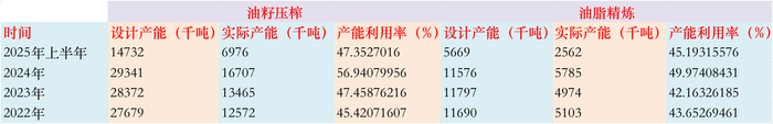 以金龙鱼为例,据2025年半年报炫夸,公司油籽压榨的联想产能达14732千吨,骨子产能为6976千吨;油脂精好意思联想产能达5669千吨,骨子产能为2562千吨。两者的产能愚弄率均不及50%。积年的数据和这也差未几。