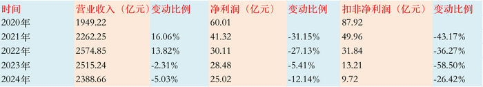 反应主交易务简直成色的方向——扣非后净利润从2020年的87.92亿元下滑至2024年的9.72亿元。2024年特别常性损益占净利润比例高达61.15%,潜入了公司对套期保值等金融用具收益的过度依赖。